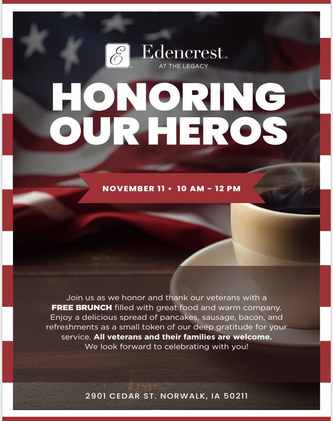 Join us as we honor and thank our veterans with a FREE BRUNCH filled with great food and warm company. Enjoy a delicious spread of pancakes, sausage, bacon, and refreshments as a small token of our deep gratitude for your service. All veterans and their families are welcome. We look forward to celebrating with you!
