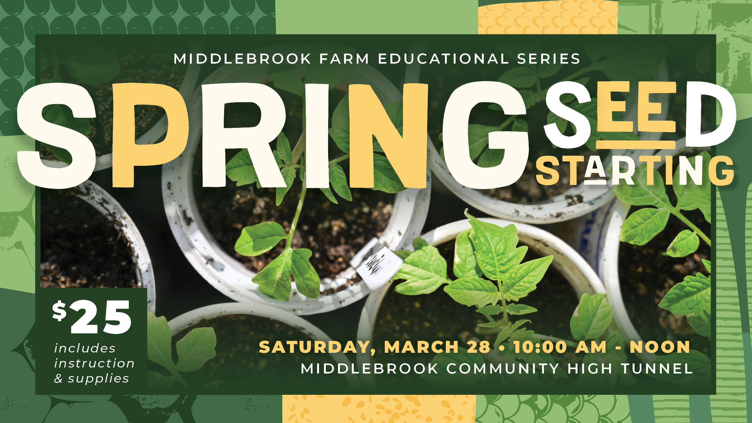 We'll provide each gardener with the tools necessary to start your plants, including planting trays, potting soil, and gardening tools. We will have a limited variety of annual flowers, herbs, vegetable, and perennial grass seed available, all harvested from our garden at Middlebrook Farm! If you have specific things you want to grow this season, please bring your own seeds with you.