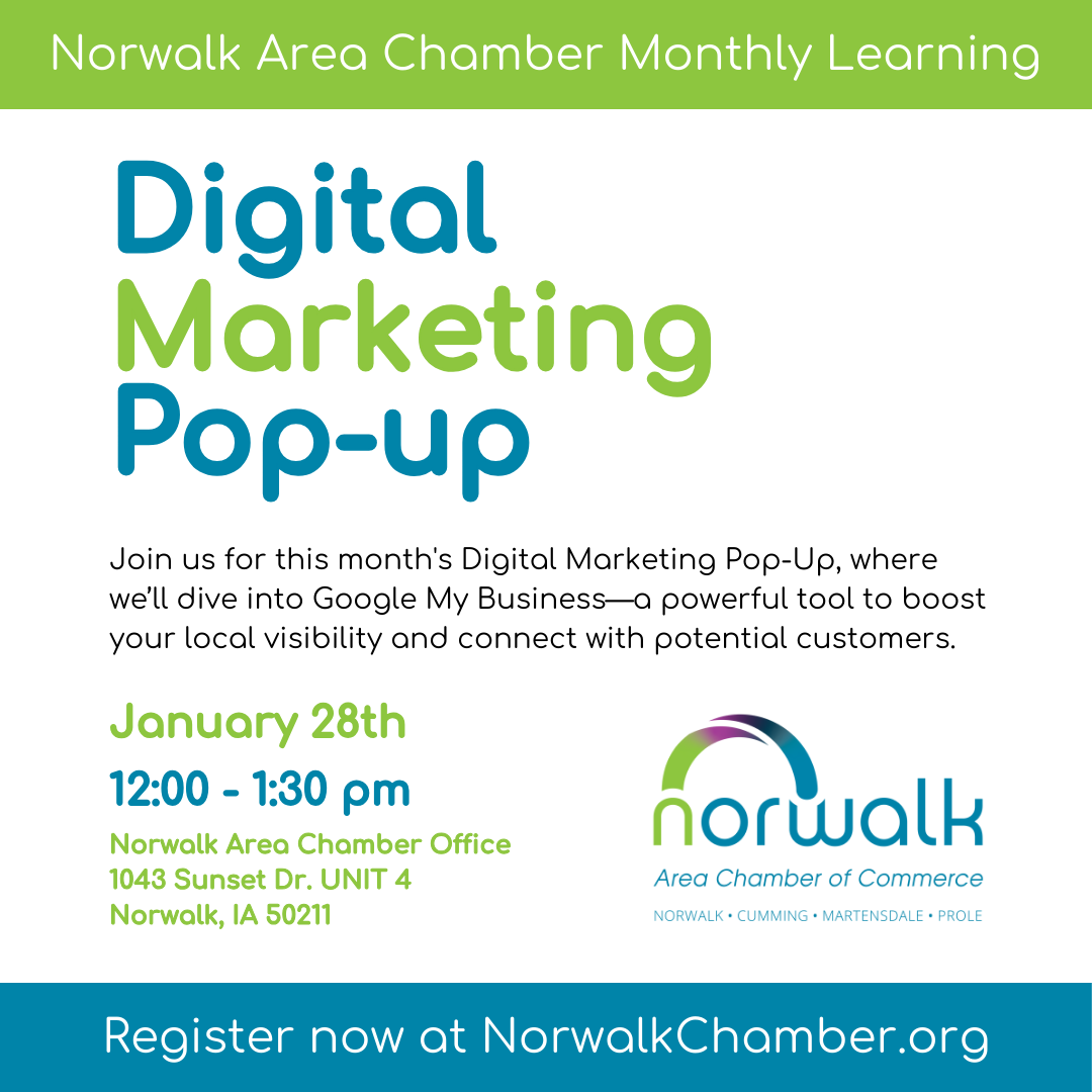 Date: Tuesday, January 28th, 2025 (add to my Calendar) Time: 12:00-1:30 pm Location: Chamber Office 1043 Sunset Dr. UNIT 4, Norwalk, IA 50211