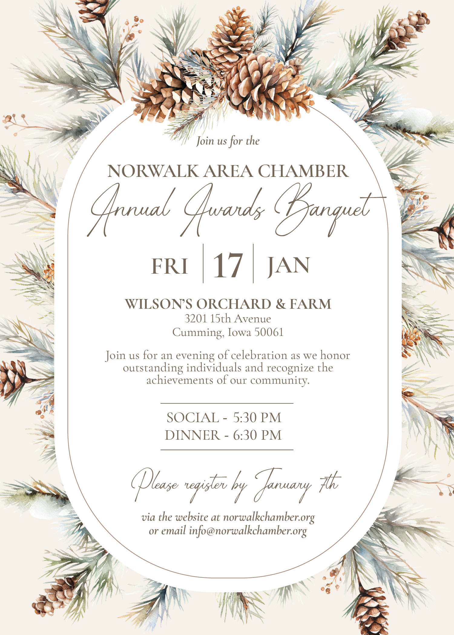 As a valued member of the Norwalk Area Chamber, we invite you to join us in honoring this year’s outstanding award recipients at our annual awards banquet! Date: January 17th (add to my calendar)