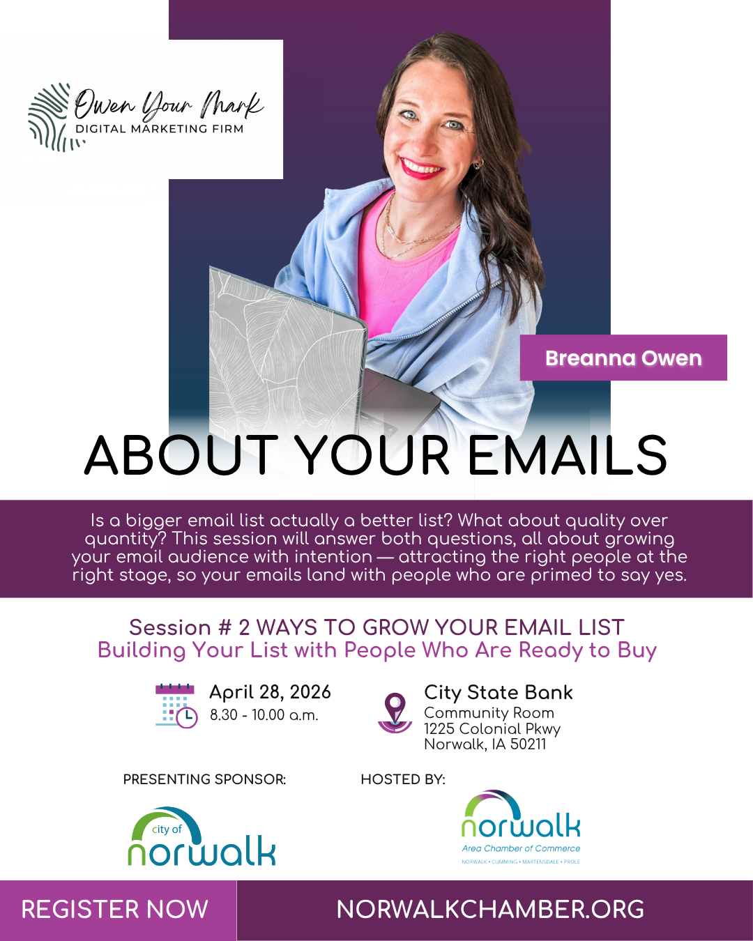 Is a bigger email list actually a better list? What about quality over quantity? This session will answer both questions, all about growing your email audience with intention — attracting the right people at the right stage, so your emails land with people who are primed to say yes. You will leave with a clear picture of which list-building strategies fit your business and a straightforward approach you can put to work without chasing every new tactic that hits your feed.
