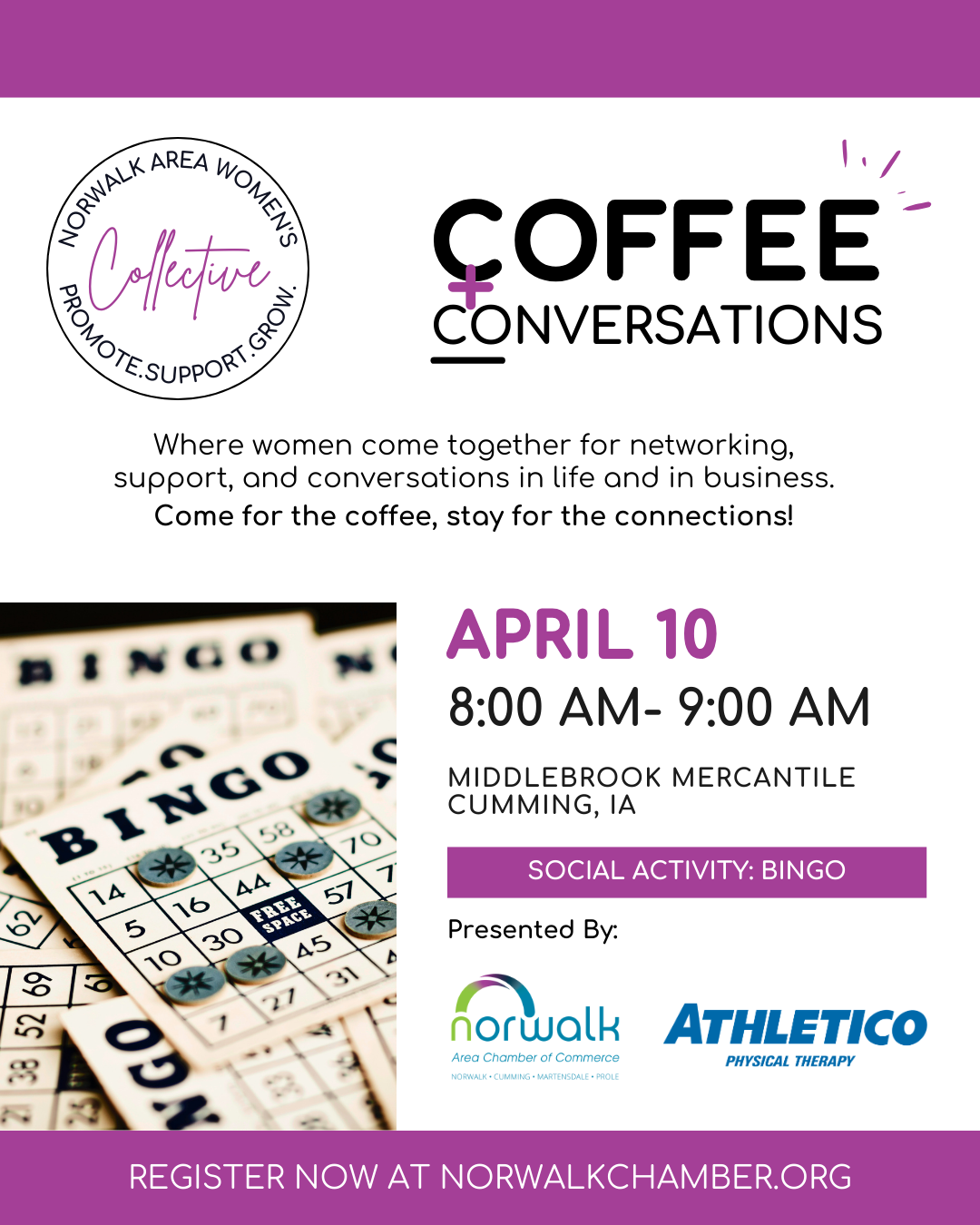 Connection meets fun at April’s Women’s Collective. Join us for a relaxed morning of bingo, conversation, and community. This is a great opportunity to meet new people and enjoy a lighthearted start to your day.